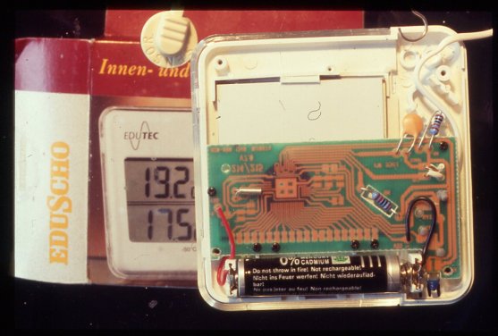Und heute: Digitalthermometer mit Minimum-Maximum, Innen und Außen, Zehntelgrade anzeigend, mit einem Schiebeschalter wird zwischen Celsius und Fahrenheit hin und hergerechnet: Sowas muss man doch haben, und wenn man Glück hat, gibt's die bei Eduscho für 12 Mark!