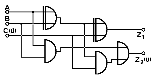 Im Allgemeinen muss man aber noch oft mit einem Übertrag rechnen, also müssen wir drei Einer, A, B und Ü addieren und einen neuen Übertrag auch weitergeben können. So entsteht aus zwei Halbaddierern und einem Oder-Gatter ein "Volladdierer" für eine Stelle: