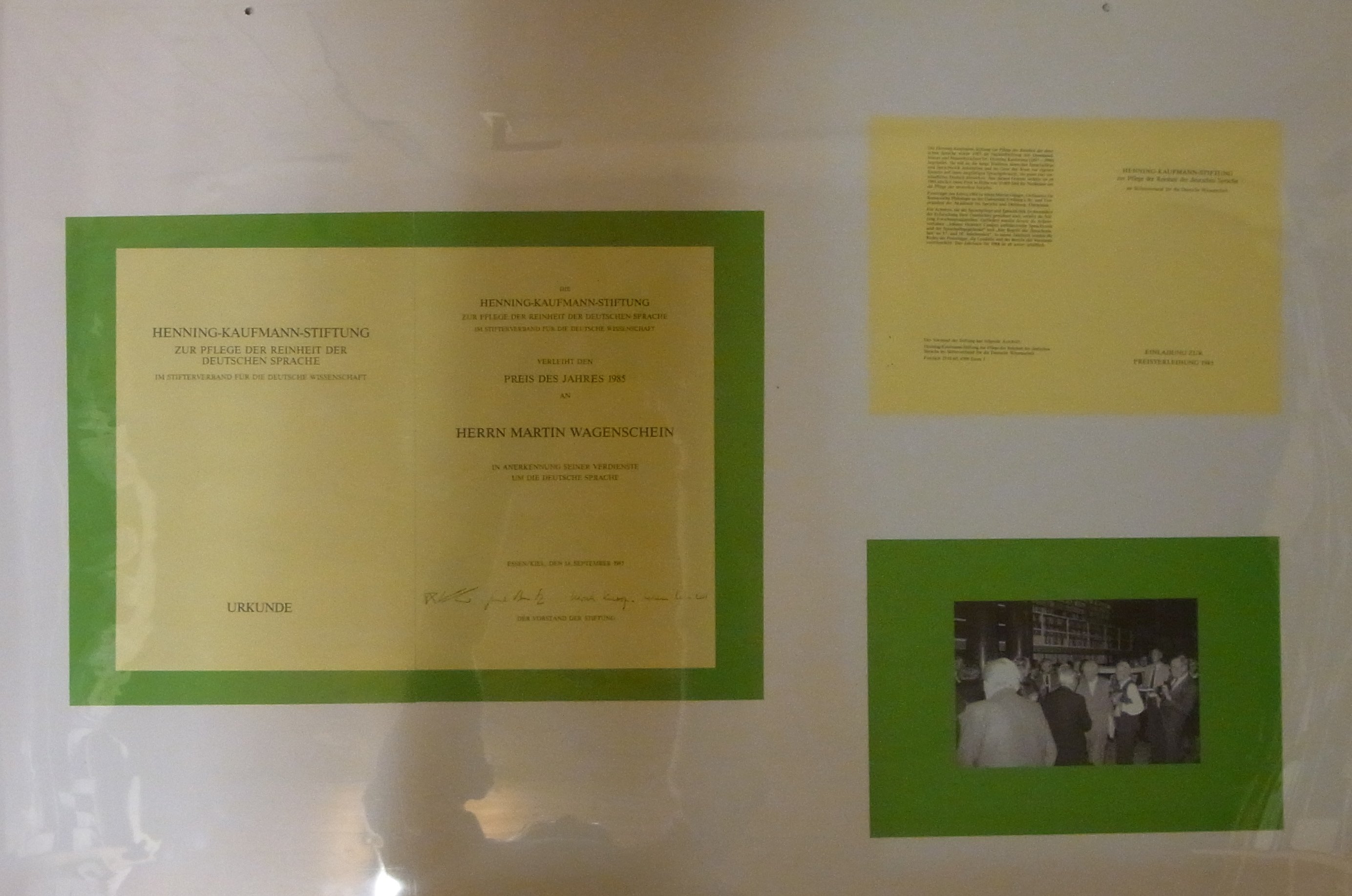 Verleihungsurkunde des Preises des Jahres 1985 der Henning-Kaufmann-Stiftung zur Pflege der Reinheit der deutschen Sprache vom 18. 12. 1985 in Wolfenbüttel mit Einladungsprogramm und Foto anlässlich der Preisverleihung