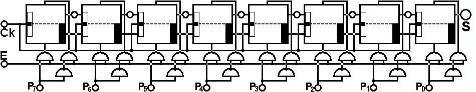 Die asynchronen RS-Eingänge jedes JK-Flipflops werden auch hier gebraucht um die parallelen Daten in das Register zu schreiben. Anders als beim Ringzähler werden sie nun aber Takt für Takt in die serielle Datenleitung hinausgeschoben.
