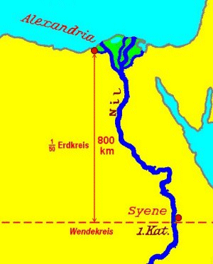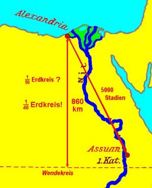 Der Rest - 5000 Stadien bis Syene - ist offensichtlich geschätzt, ebenso war die Annahme, dass Syene südlich von Alexandria liegt "über den Daumen gepeilt".