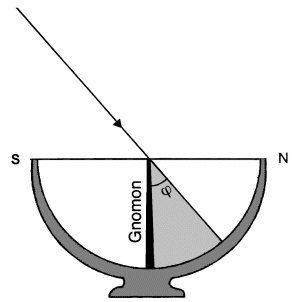 (Ein Stab, dessen Durchmesser ein Hundertstel des Radius der Skaphe beträgt, und oben halbkugelig abgerundet ist - Krümmungsmittelpunkt im Mittelpunkt der Skaphenkugel - liefert unter allen Einfallswinkeln einen genauen Kernschattenzeiger, denn der scheinbare Durchmesser der Sonne beträgt ein Hundertstel Radian.)