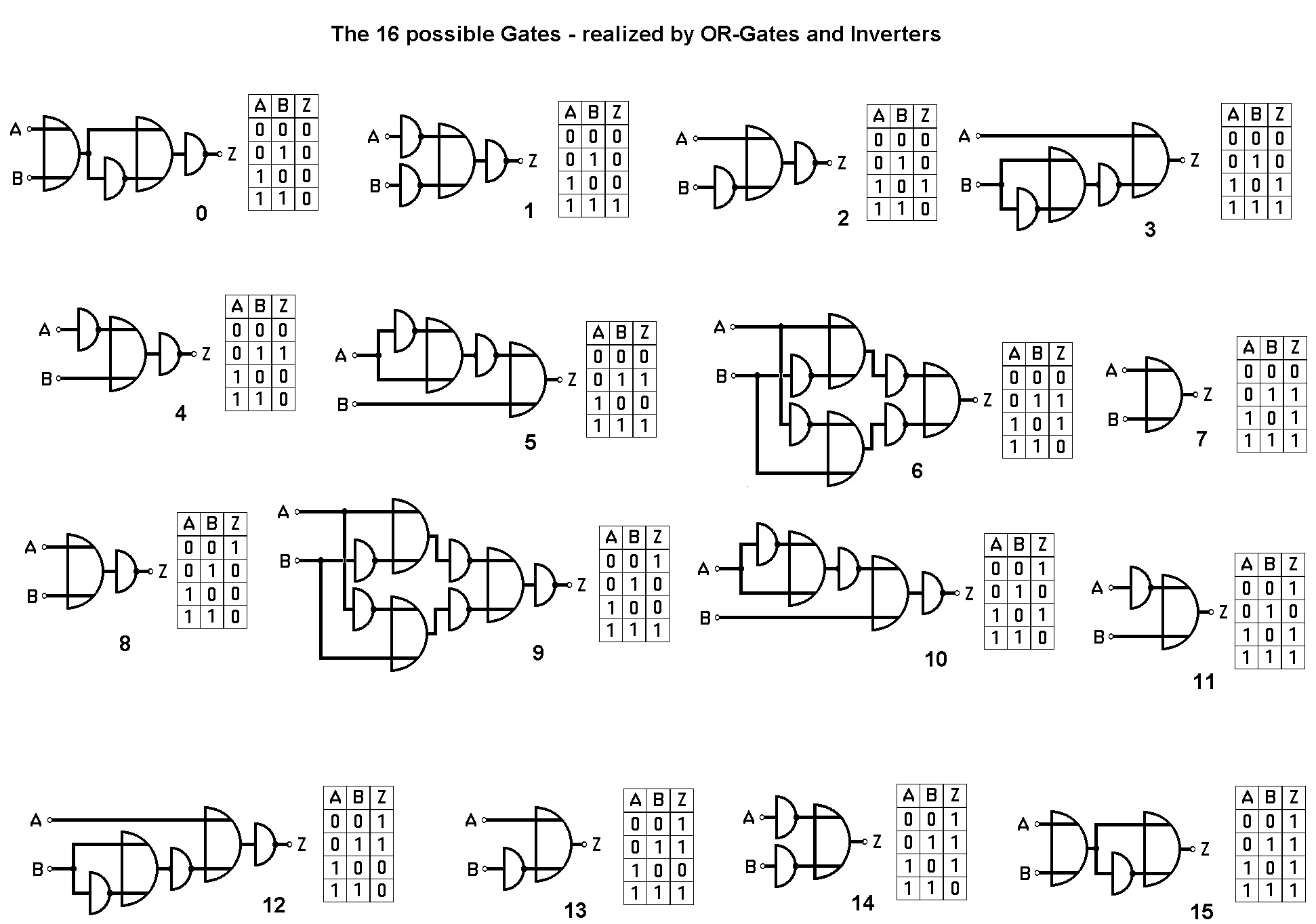The logical answer to it will puzzle even the discoverer! And after that the astonishing feat that each of these 16 functions can be achieved by combining e.g. OR-gates and inverters: