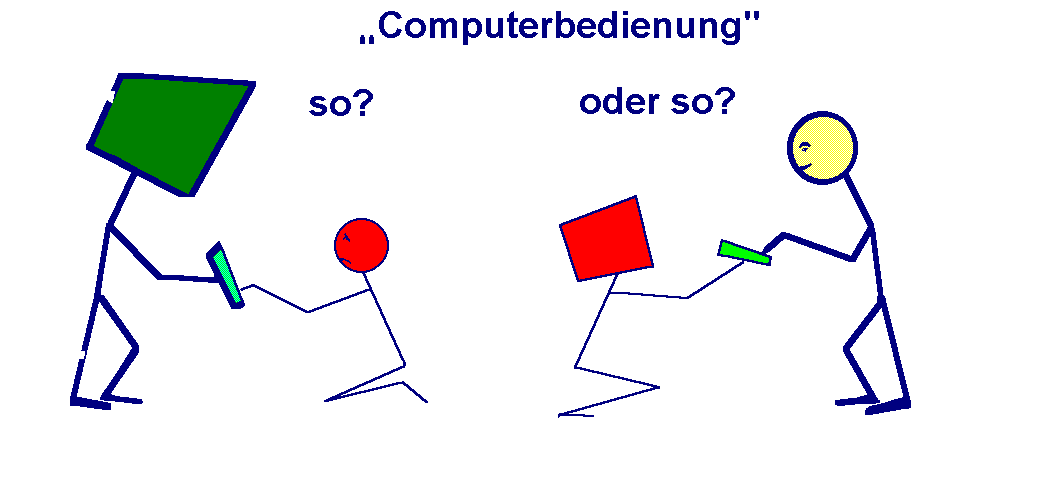 Turning away from understanding the machine seems to be essential when you realize its complexity - still marching on to a higher grade: A modern processor - the central processing unit - contains [1] about 5 millions of transistor elements on its chip. I refer to the "Pentium" - do you remember the gloating complacent rumor in the media, when the possibility of a malfunction had turned out? A comparison: A month counts about 2.5 million seconds. Now imagine a genious expert of electronics, detecting by only one second the function and purpose of a transistor and the right position of it. This Superman (or Supergirl) would need two months of uninterrupted work (without eating or sleeping) to read the concept of the wiring diagram... You see: No human beeing would be able to understand a ready-made computer by all its details! Even more will that conclusion fit to the programs. Here are not millions but umpteens of millions steps 'normal'. Do you really believe Bill Gates knows all about Windows? - Why should we in school delay with the details of the computer and its programs?