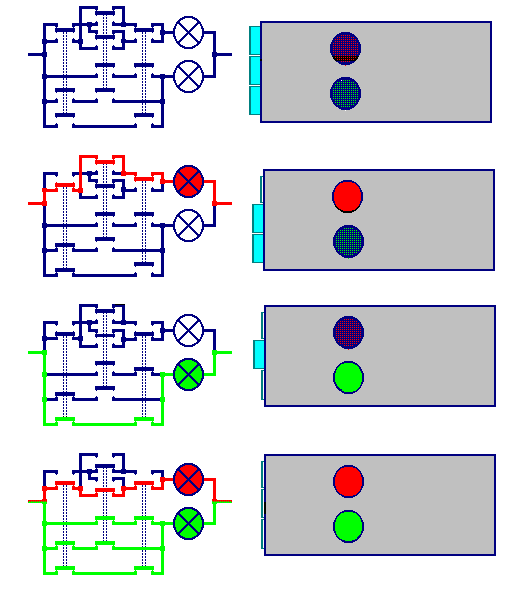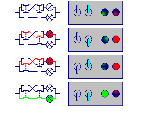 It is the same situation as with the lamp boxes we just have used. Their behavior is strictly dependent on their inner construction and the position of the input switches. Actually important is the possibility of miniaturizing to "Integrated circuits" That can roughly been shown by the production of a printed board in a practical training which may give an outlook to sub-miniaturized mass production by huge enterprizes.