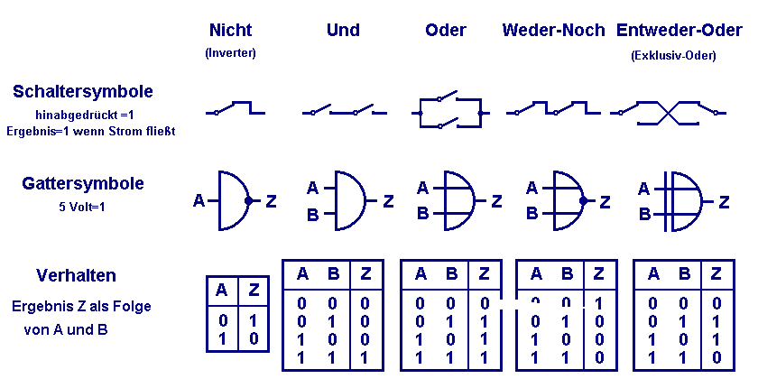 No longer represents its drawing the way of action (as the switch symbol still did similar to an Egyptian hieroglyph). It is an empty sleeve getting its contents and meaning only by definition, similar to the fact that our Latin letters give no hint how to spell them. Five important types are presented here, a speciality is the inverter, always giving as result the opposite of its (single) input.