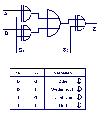This group lost its constructed stiffness - we got a "Universal Gate" to whom we can give control signals, how it should manage the data signals: OR / NOR / NOT AND (NAND) / AND.